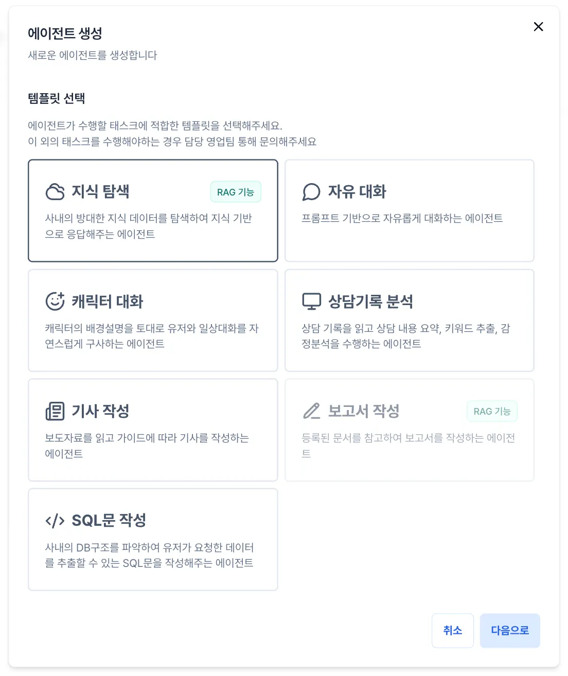 에이전트가 수행해야할 태스크의 성격에 따라 템플릿을 활용하여 빠르게 시작하실 수도 있습니다.