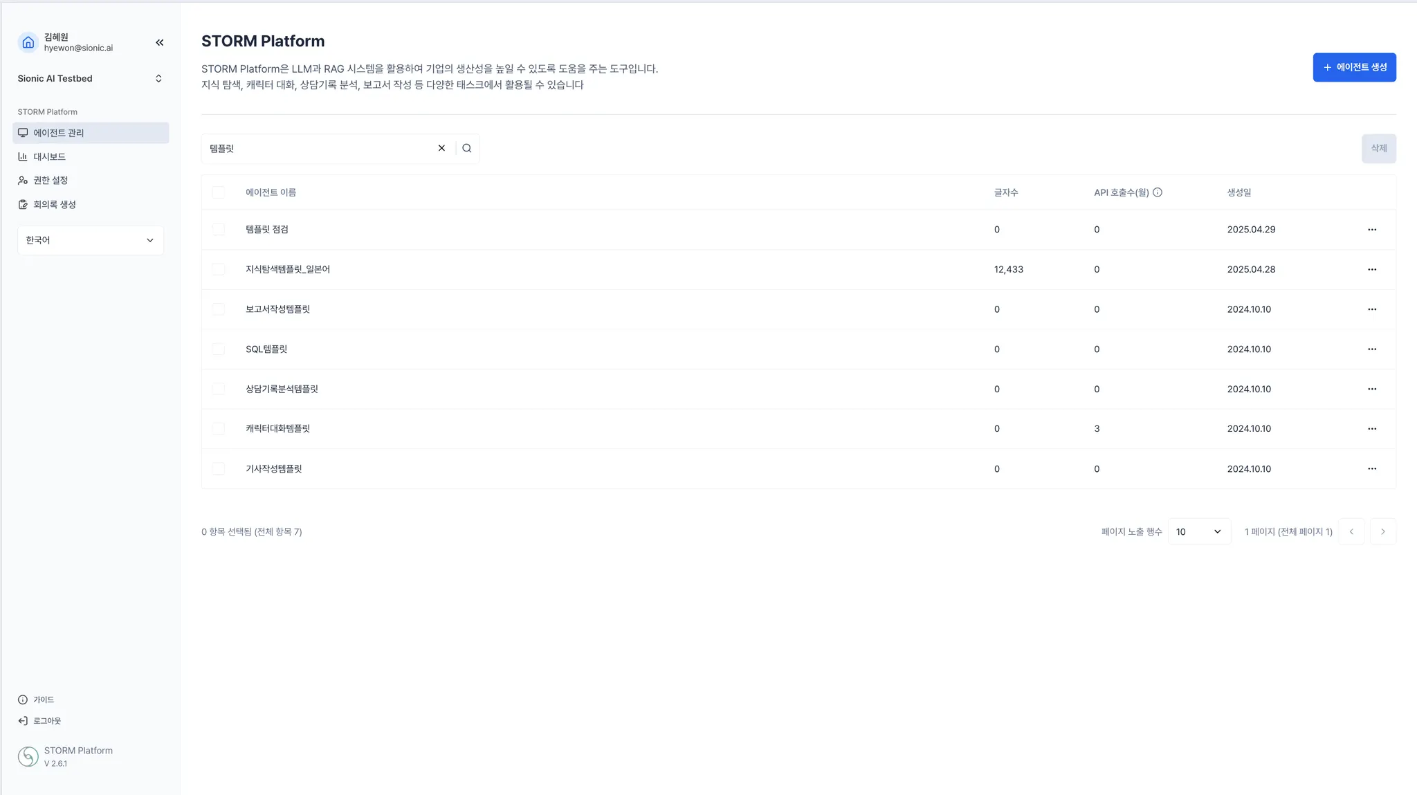 에이전트 관리 페이지에서는 에이전트 리스트를 관리하거나 새로운 신규 에이전트를 생성할 수 있습니다.