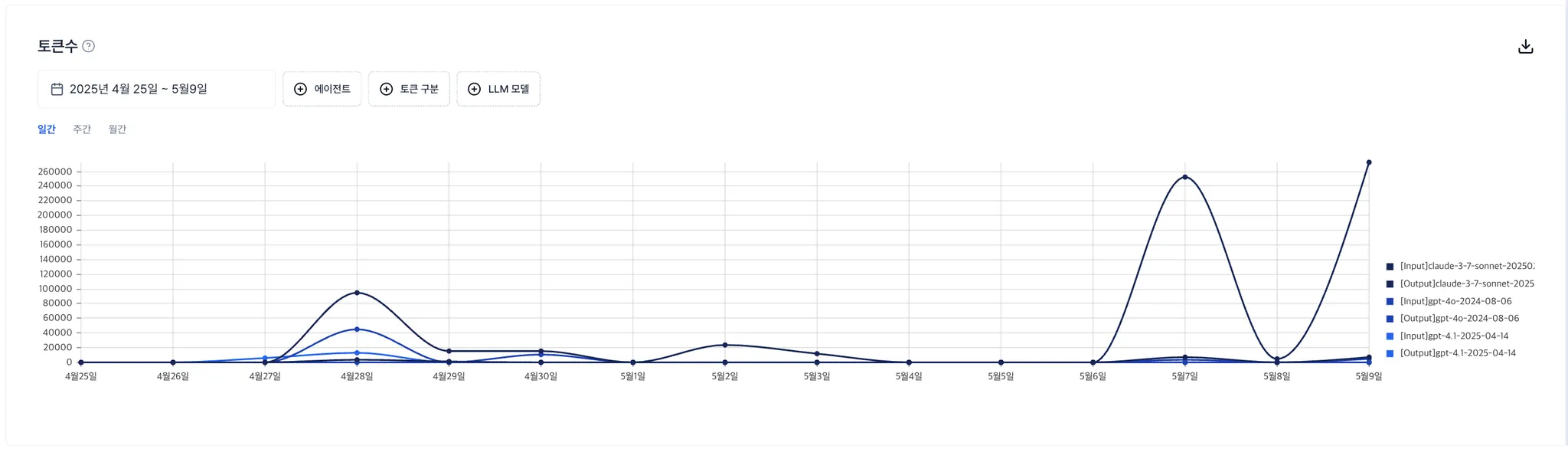 사용한 LLM 모델별로 Input 토큰과 Output 토큰을 구분하여 확인할 수 있습니다.